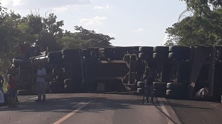 A carreta, que transportava botijões de gás, tombou sobre a pista, ocupando-a de uma extremidade a outra.