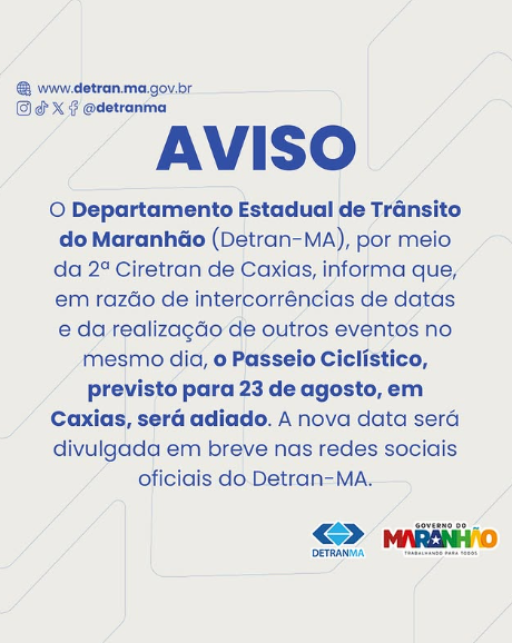 O Departamento Estadual de Trânsito do Maranhão (Detran-MA), por meio da 2ª Ciretran de Caxias, informou o adiamento do Passeio Ciclístico que estava previsto para acontecer no próximo dia 23 de agosto.