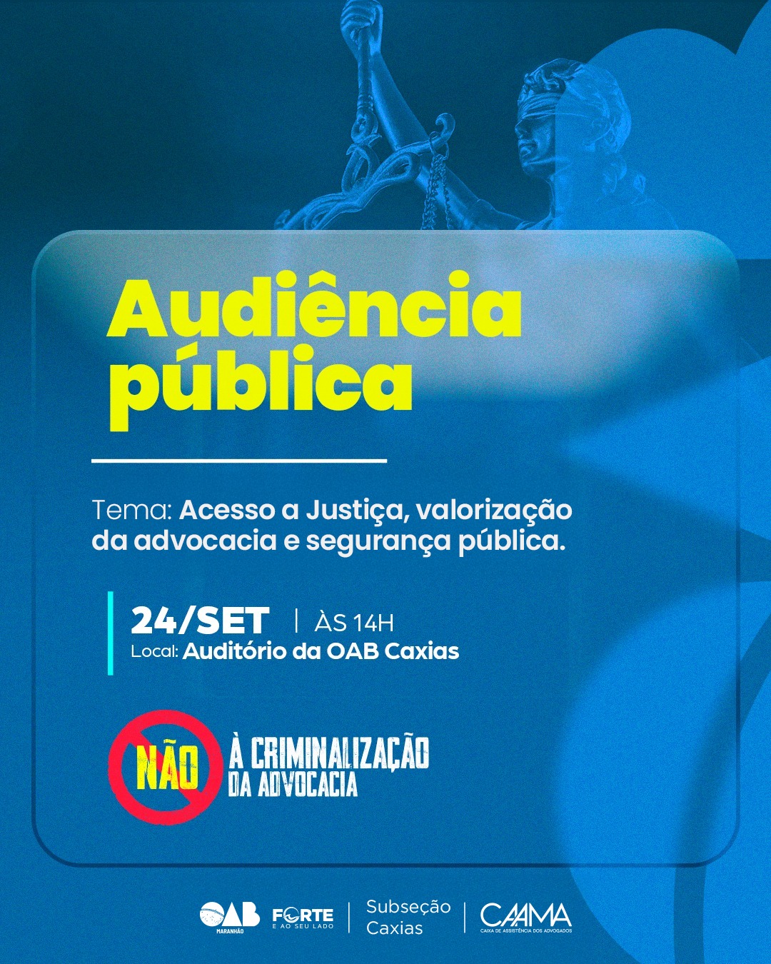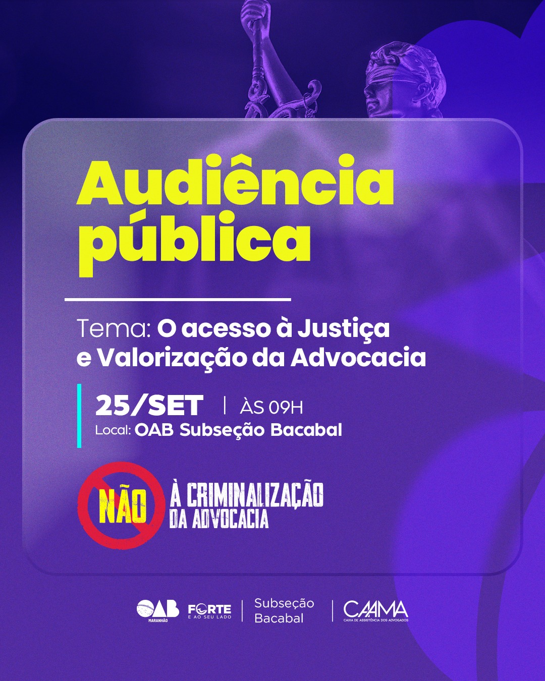 A Ordem dos Advogados do Brasil, Seccional Maranhão (OAB/MA), organiza em parceria com as OAB Caxias e Bacabal, mais uma audiência pública intitulada “O acesso à Justiça e Valorização da Advocacia”. As atividades acontecem às 14h do dia 24/09 na sede da Subseção Caxias e às 9h do dia 25/09 na Subseção Bacabal. Serão as 6ª e 7ª audiências públicas com o objetivo de ouvir demandas, identificar desafios e propor soluções conjuntas para o fortalecimento da prestação jurisdicional no estado.