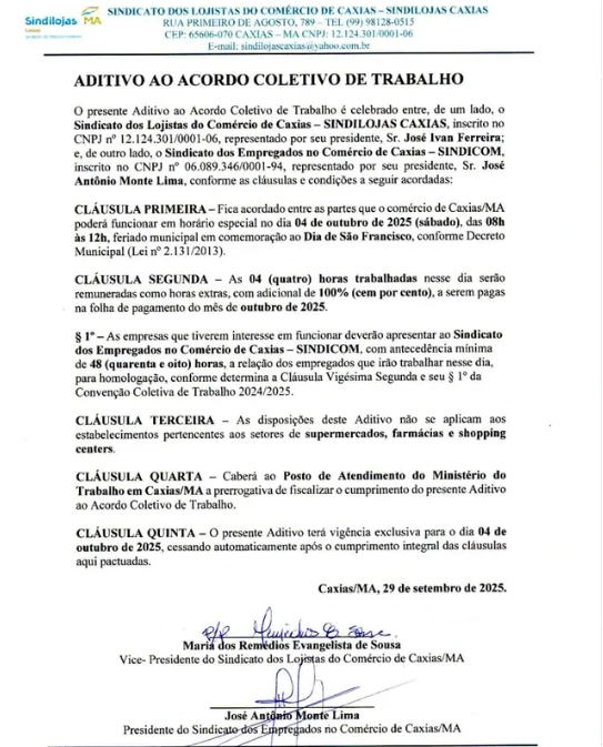 O Sindicato dos Lojistas de Caxias (Sindilojas) informou que, excepcionalmente, o comércio do município poderá funcionar no próximo sábado, 04 de outubro, data em que se celebra o feriado municipal de São Francisco.