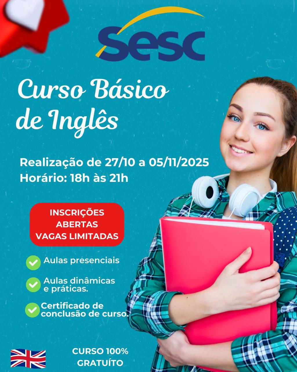 O Serviço Social do Comércio (Sesc) em Caxias está com inscrições abertas para o Curso Básico de Inglês, totalmente gratuito. As vagas são limitadas e as aulas acontecerão de 27 de outubro a 5 de novembro, de forma presencial, com uma metodologia dinâmica e prática.