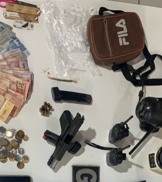 Durante a averiguação, os policiais constataram que se tratava de uma pistola calibre .40, carregada com nove munições intactas. Em continuidade às buscas no interior do imóvel, foram apreendidos ainda dinheiro em cédulas fracionadas, materiais comumente utilizados no tráfico de drogas, um carregador adicional da arma e câmeras de videomonitoramento.