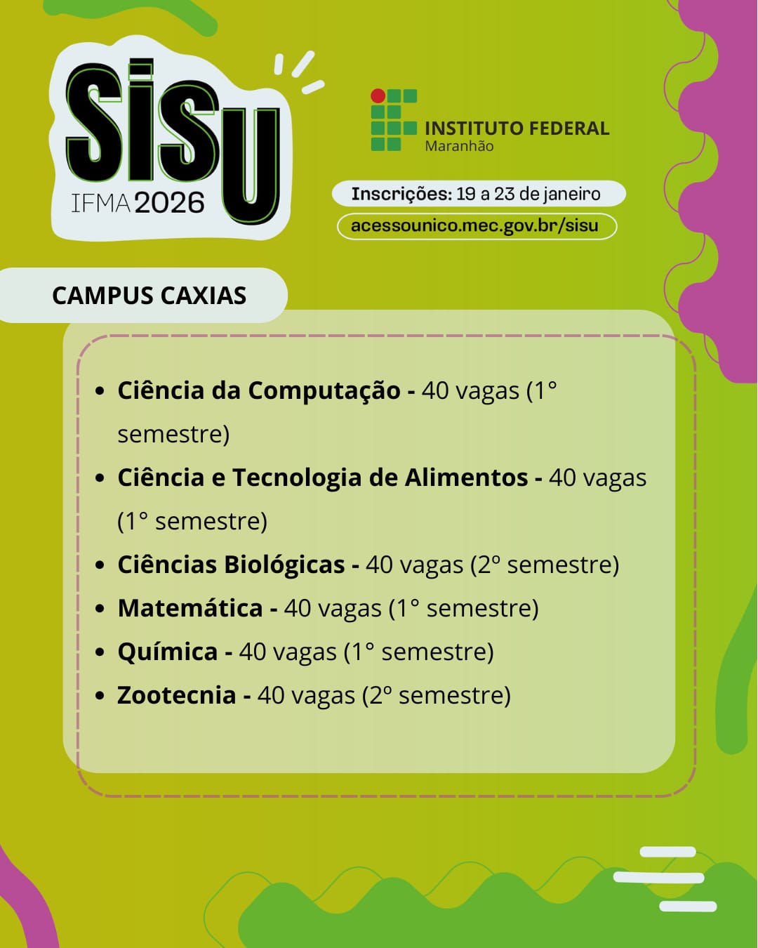 Neste ano, o IFMA está ofertando vagas em 22 campi espalhados pelo estado. No Campus Caxias, são disponibilizadas 240 vagas, distribuídas entre cursos de bacharelado e licenciatura, com ingresso no primeiro e segundo semestres de 2026. No primeiro semestre, os candidatos poderão concorrer às vagas nos cursos de Ciência da Computação (manhã e tarde), Ciência e Tecnologia de Alimentos (tarde e noite), Licenciatura em Matemática (tarde e noite) e Licenciatura em Química (tarde e noite). Já no segundo semestre, as oportunidades são para Licenciatura em Ciências Biológicas (tarde e noite) e Bacharelado em Zootecnia (manhã e tarde). Clique aqui e saiba mais sobre os cursos ofertados pelo Campus Caxias.