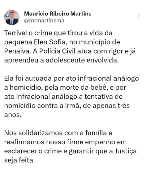 “Terrível o crime que tirou a vida da pequena Elen Sofia, no município de Penalva. A Polícia Civil atua com rigor e já apreendeu a adolescente envolvida”, declarou.