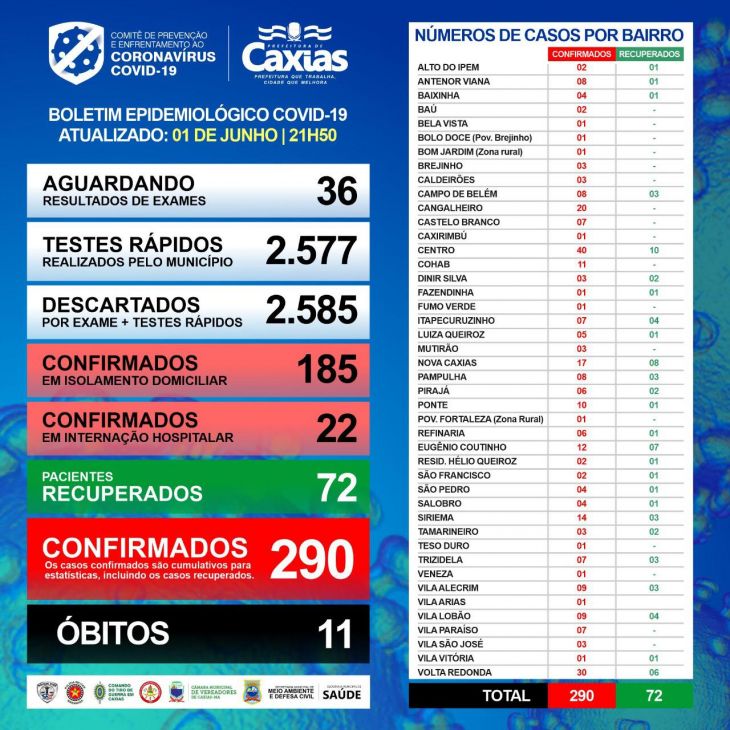 Caxias está entre os 212 municípios do estado com registro de casos confirmados da doença. O Maranhão chegou a 36.625 casos confirmados do novo coronavírus, 997 óbitos e 11.473 curados, segundo dados da Secretaria de Estado da Saúde (SES).